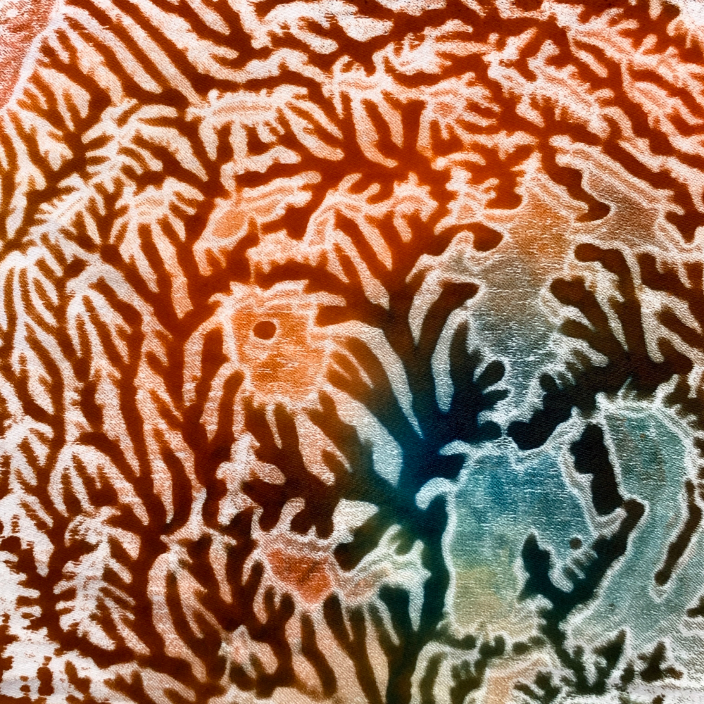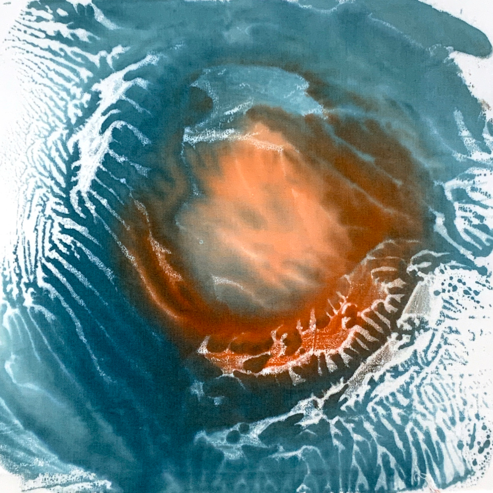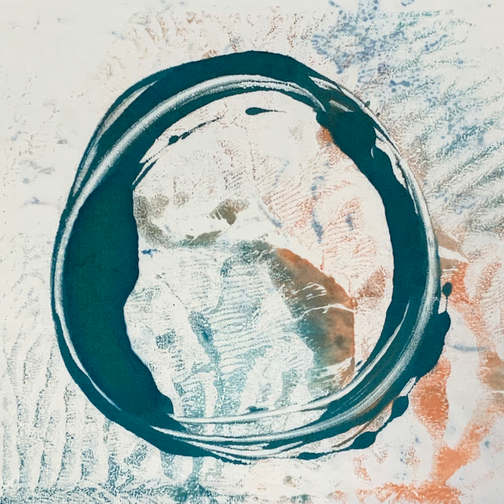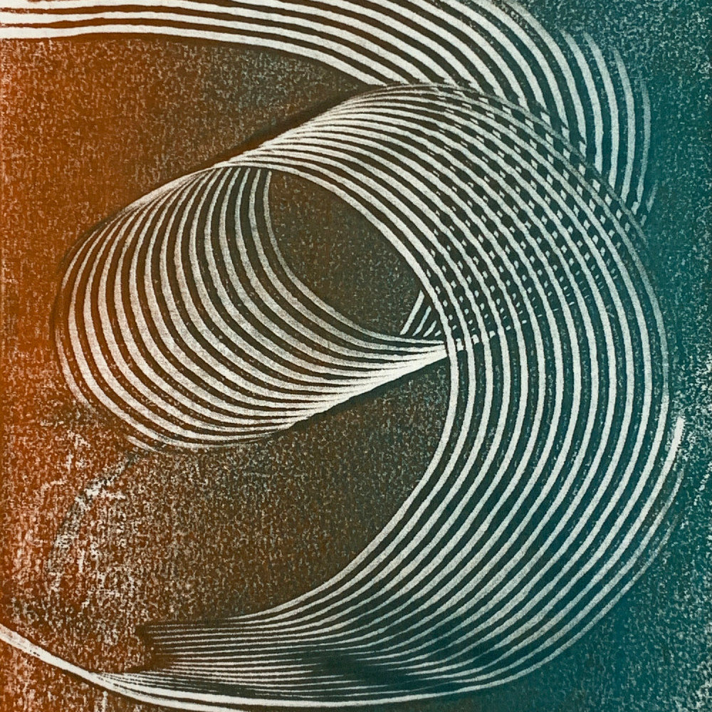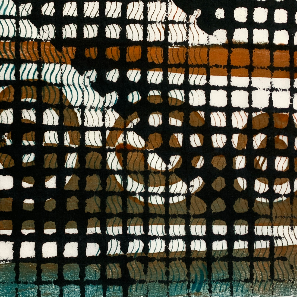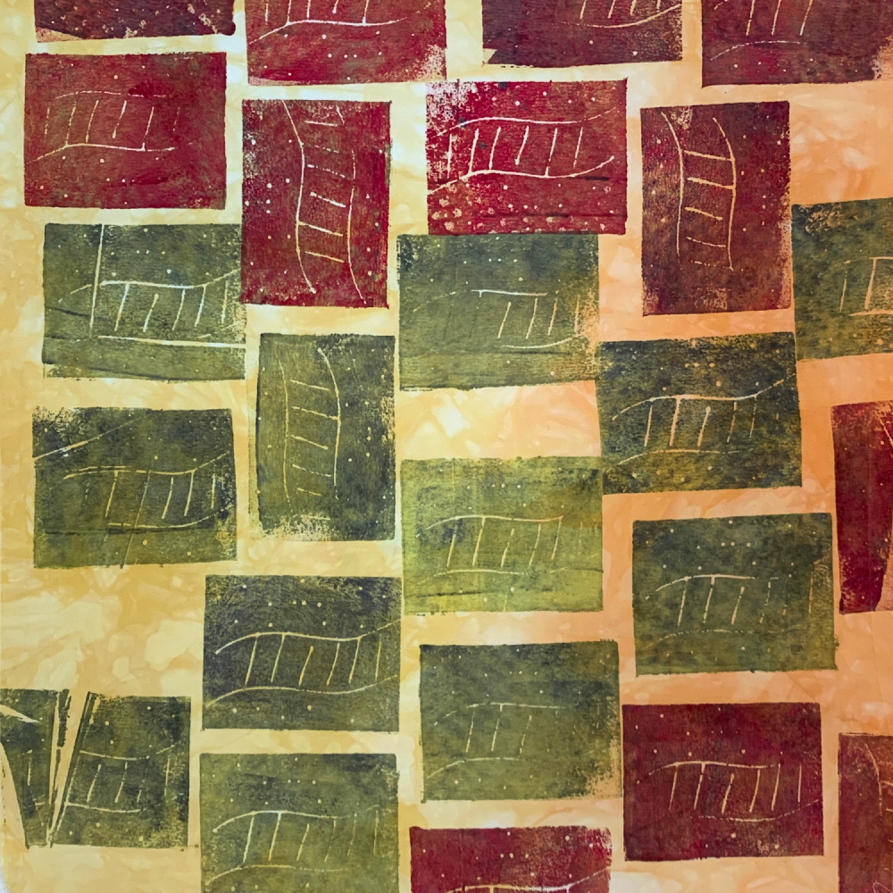 Ann emphasizes printing with blocks and stamps of your design to develop your own style. She discusses how to choose materials, some that can be heat molded, others that can be scored to make very fine lines, adjusting the viscosity of the colors as needed by the materials. You see how to create complexity by overlapping and varying scale and direction of prints. Colors: rusts and aquas.
