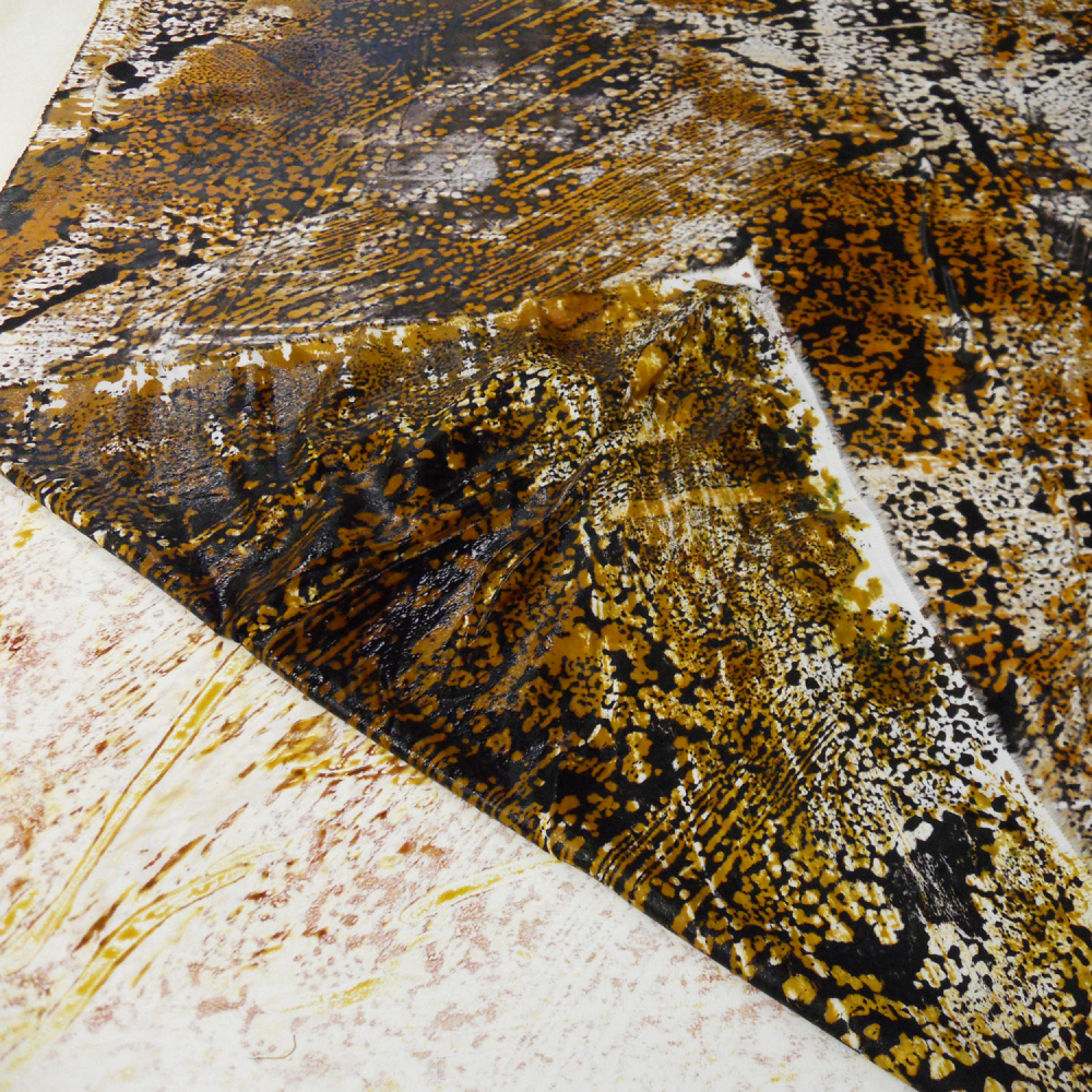 Learn to make a unique print each time the fabric and dye are in contact with each other. Monoprinting is a world of variety; Ann demonstrates how to manage the viscosity of the dye and how to choose the surfaces that enable you to get very different results. She demonstrates working on a series of silk fabrics that change with each print. Colors: gold, navy, dark green and values.