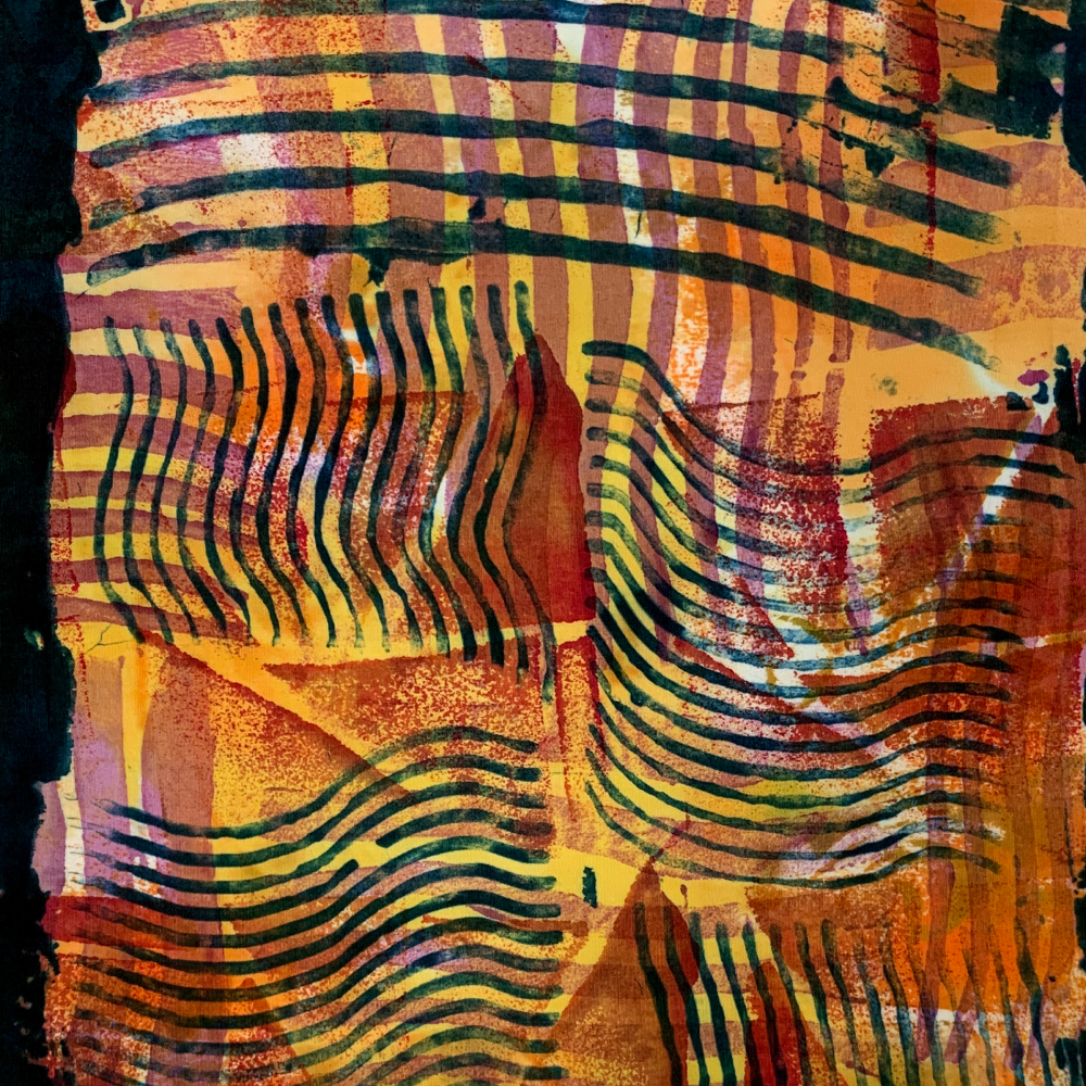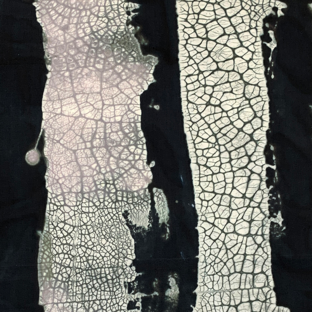 Ann compares some resists, applying the criteria of ease of use and complete block-out of the dye. She demonstrates her favorites, corn and potato dextrin, and some of their possible applications including working in successive layers of color and resist. An additional handout gives you details and recipes. Colors: dark navy, gold, lime green, duller orange and black.