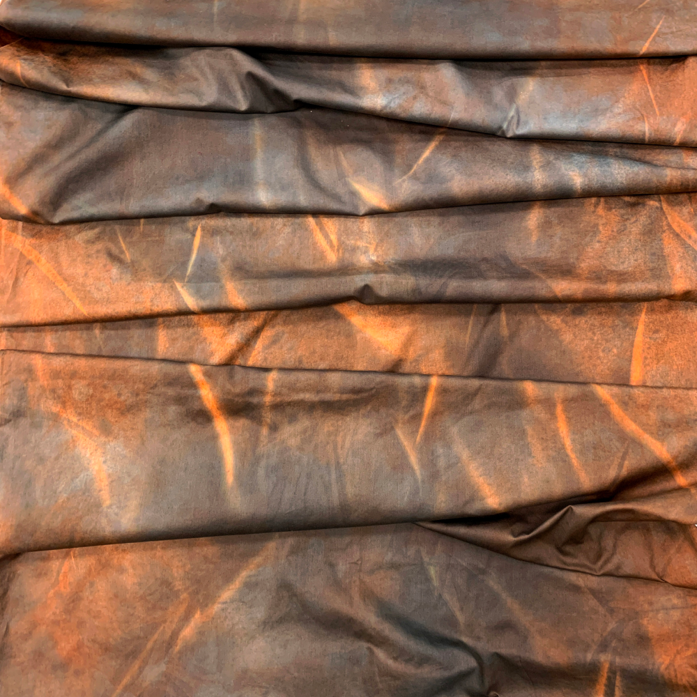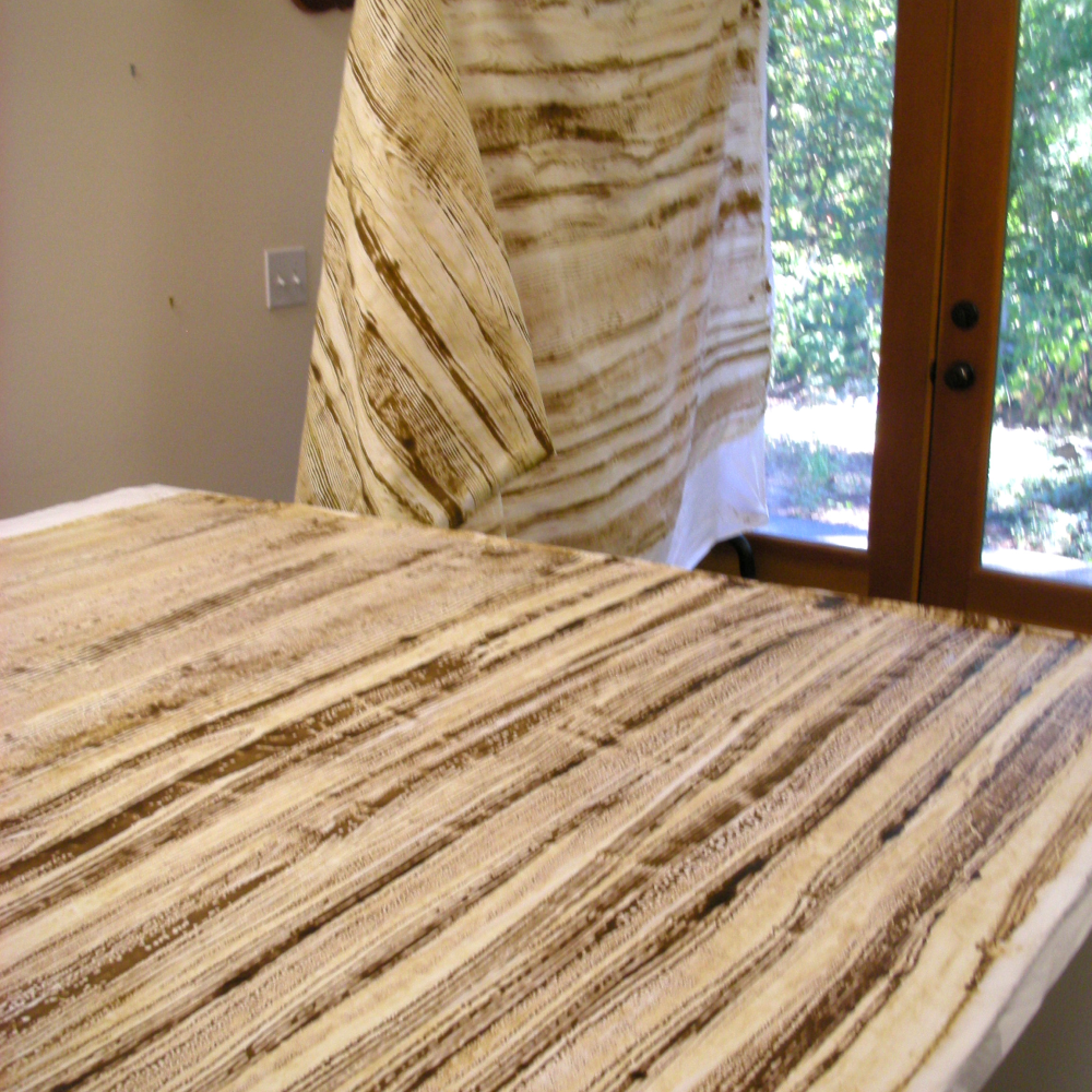 Ann moves to larger scale fabric for her demonstrations with some new approaches to pattern-making. She also demonstrates a shortcut to adding color to the background after the fabric is printed and/or painted but before it is washed: low-water immersion dyeing. The full LWI process is described in an additional handout. Colors: gold, brown/tan, warm blue, rust/orange.